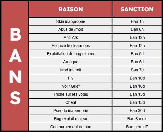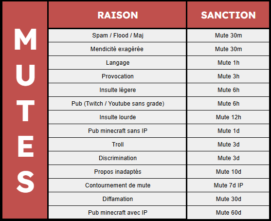 🔸 Les membres du staff supérieur à modérateur n'ont aucune obligation de respecter ce tableau et peuvent appliquer une sanction plus adéquate à la situation.